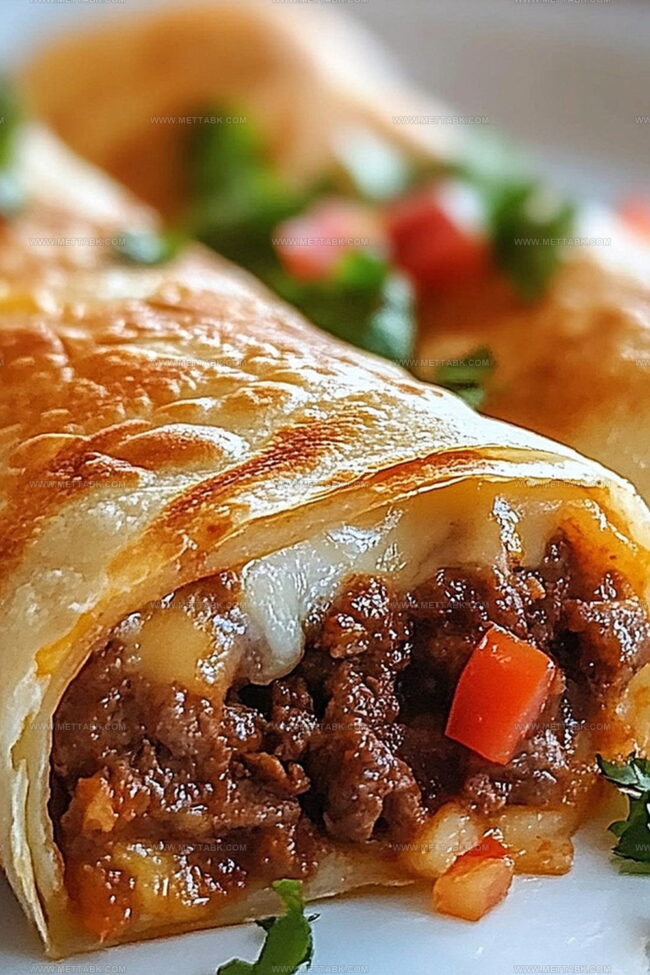 Spoon the beef and cheese mixture into the center of each tortilla. Fold the sides inward, then roll tightly from the bottom to create a neat, secure package.