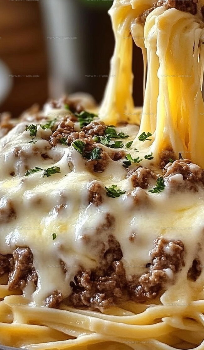 Hearty cheesy beef alfredo with linguine combines Italian-American comfort flavors in one satisfying meal. Creamy parmesan sauce and seasoned ground beef create a rich, indulgent pasta experience you can savor at home.