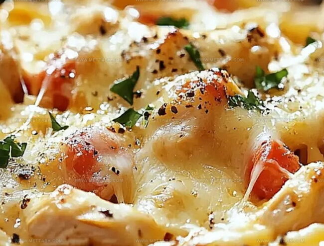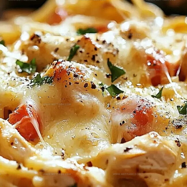 Creamy textures blend perfectly with tender chicken pieces and al dente pasta.