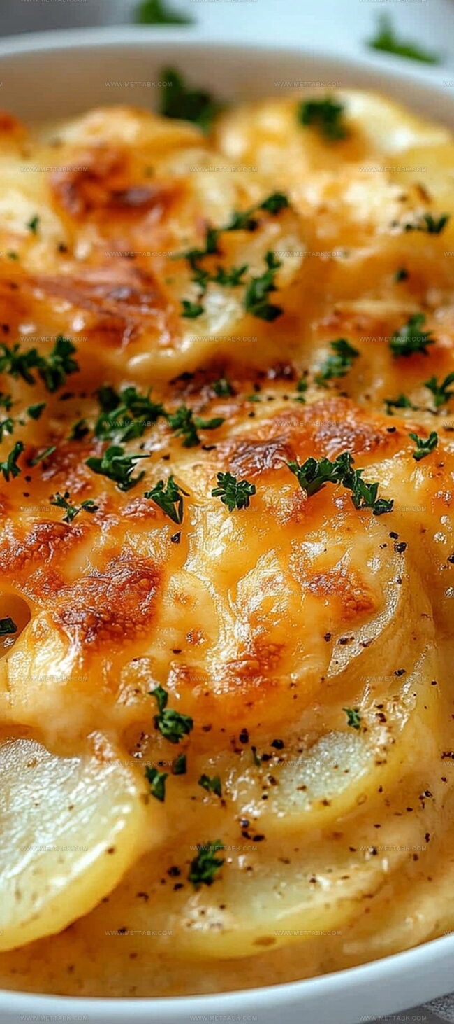 Layers of thinly sliced potatoes nestled between creamy, melted cheese create a comfort food masterpiece.