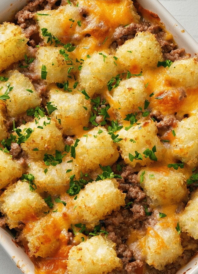 Each bite combines rich, seasoned beef with golden-brown tots that crunch perfectly against melted cheese.