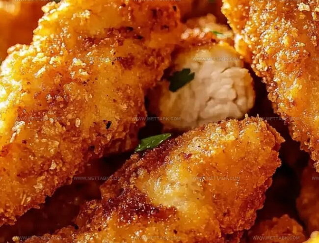 Thin, breaded chicken strips similar to chicken tenders, originally from French cuisine, typically coated in breadcrumbs and baked or fried until crispy and golden.