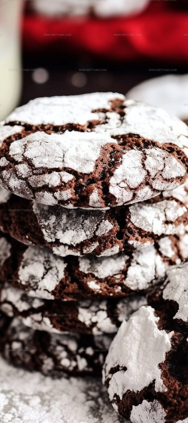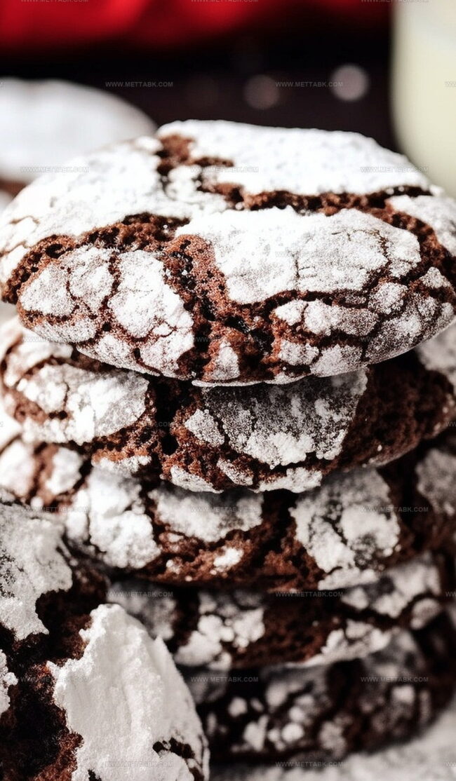The crinkle effect comes from rolling the cold dough balls in powdered sugar before baking. As the cookies bake, they spread and crack, creating the distinctive crinkle look with white powdered sugar showing through the dark chocolate surface.