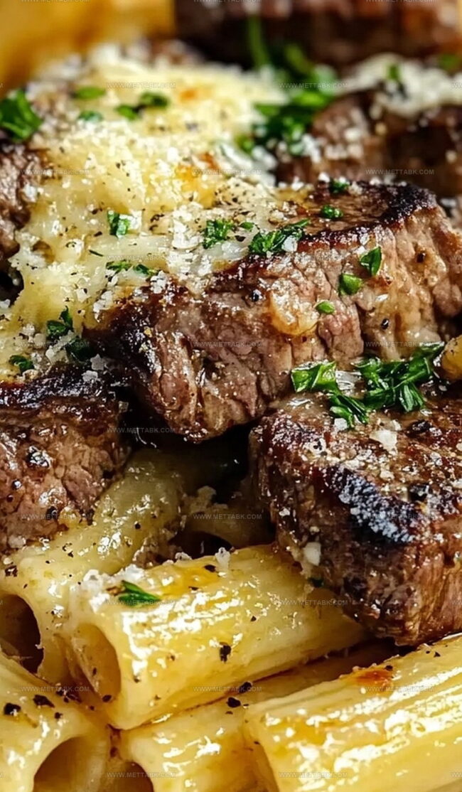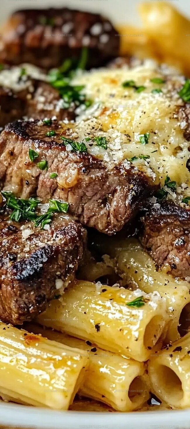 - Transfer cheesy rigatoni to serving plates, elegantly arranging the garlic-infused steak tips on top. Optional: Garnish with fresh chopped parsley or an additional sprinkle of Parmesan cheese for enhanced flavor and presentation.