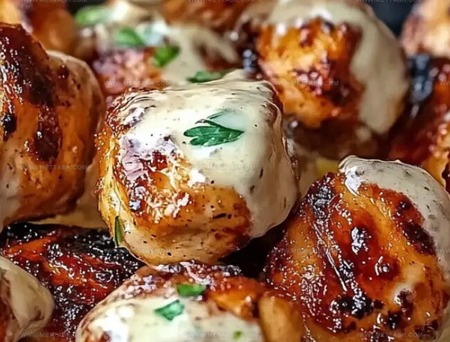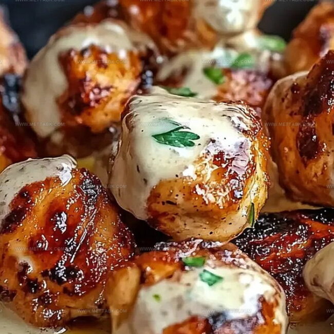 Crispy, golden grilled chicken bites dance with a luscious creamy garlic sauce that promises pure delight.