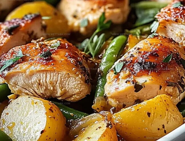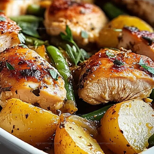 Tender chicken nestles perfectly among golden potatoes and crisp green beans, creating a harmonious blend of ingredients.