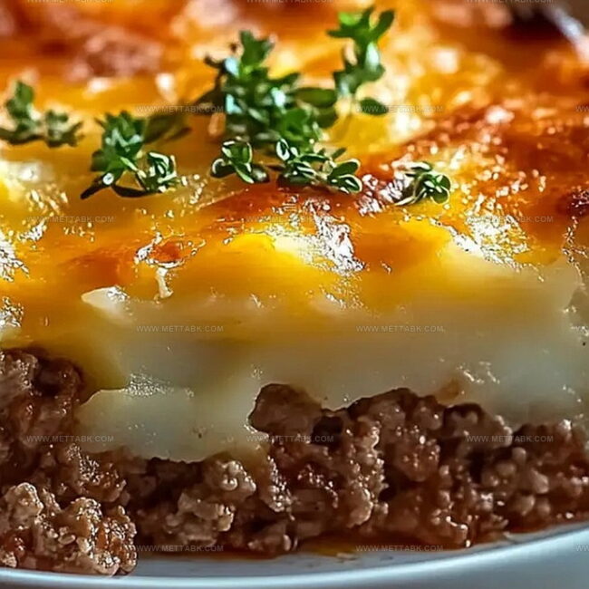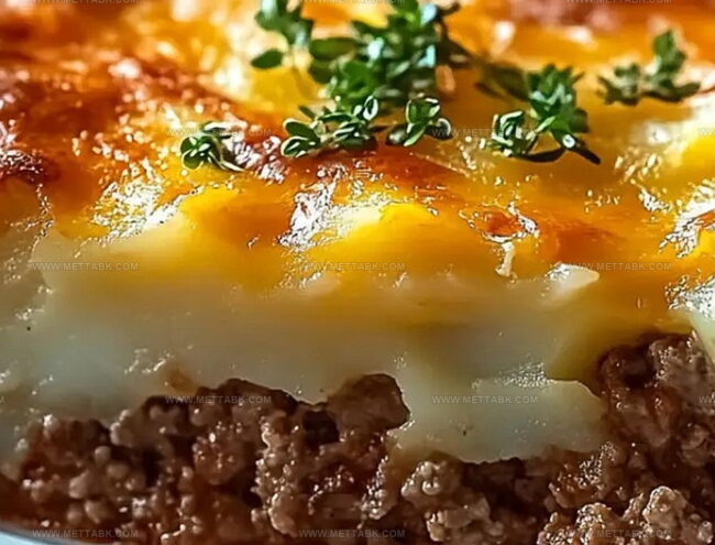 Layers of savory ground beef blend seamlessly with creamy mashed potatoes and crispy bacon bits.