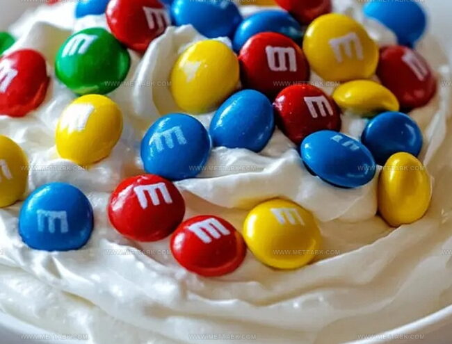 Sweet memories flood back when I blend m&ms cool whip and pudding frosting into a delightful dessert that sparkles with childhood nostalgia.