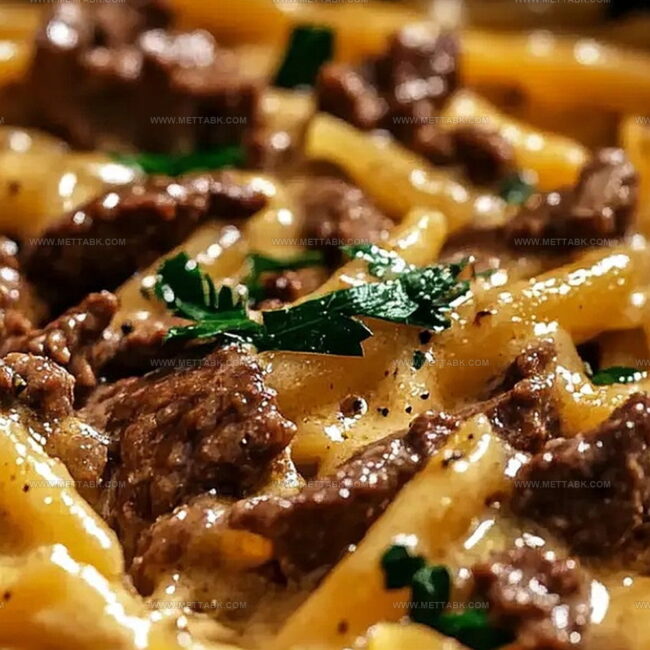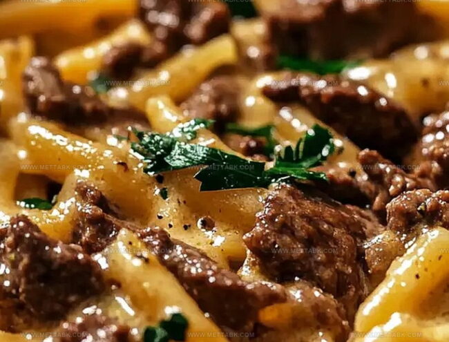 Tender pasta threads intertwine with seasoned beef, creating a luxurious texture that melts in your mouth.