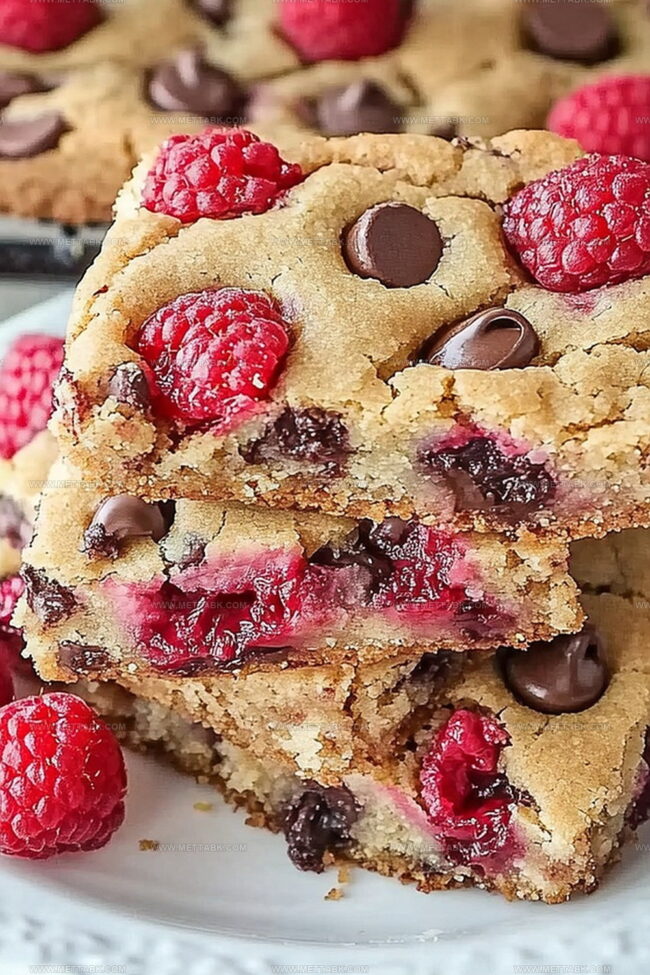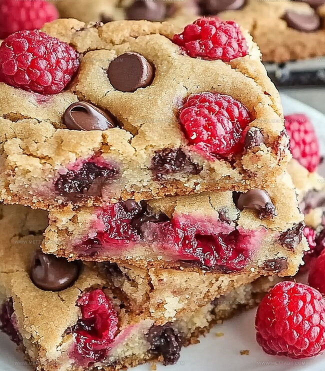 Raspberry chocolate chip cookie bars combine sweet-tart berries with classic chocolate chip cookie comfort. Homemade treats merge fruity flavors with rich chocolate in a simple, delightful dessert you can enjoy with friends and family.