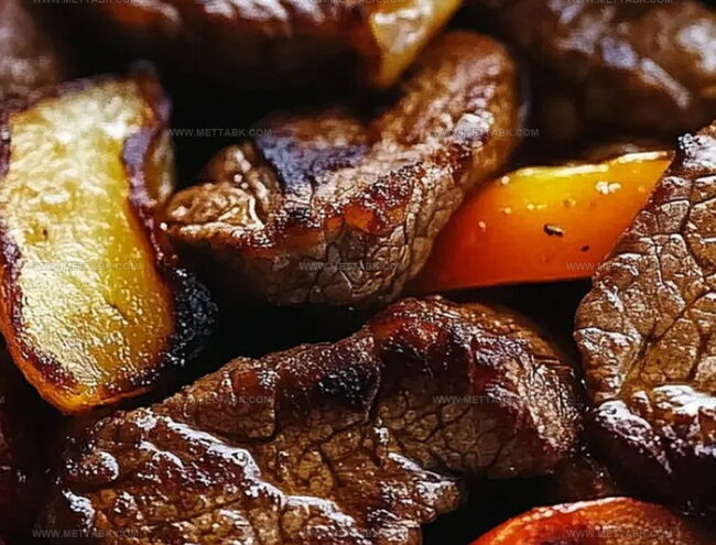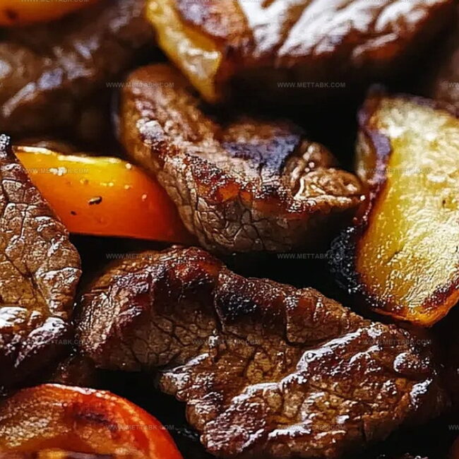 Tender strips of beef mingle with colorful bell peppers and onions, creating a vibrant palette of tastes and textures.