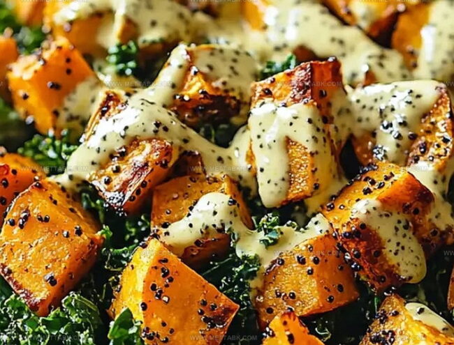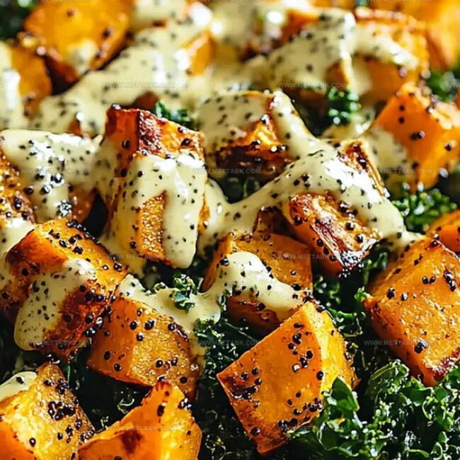 Crisp kale leaves intertwine with roasted golden sweet potato cubes, creating a texture symphony.