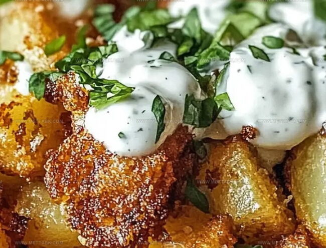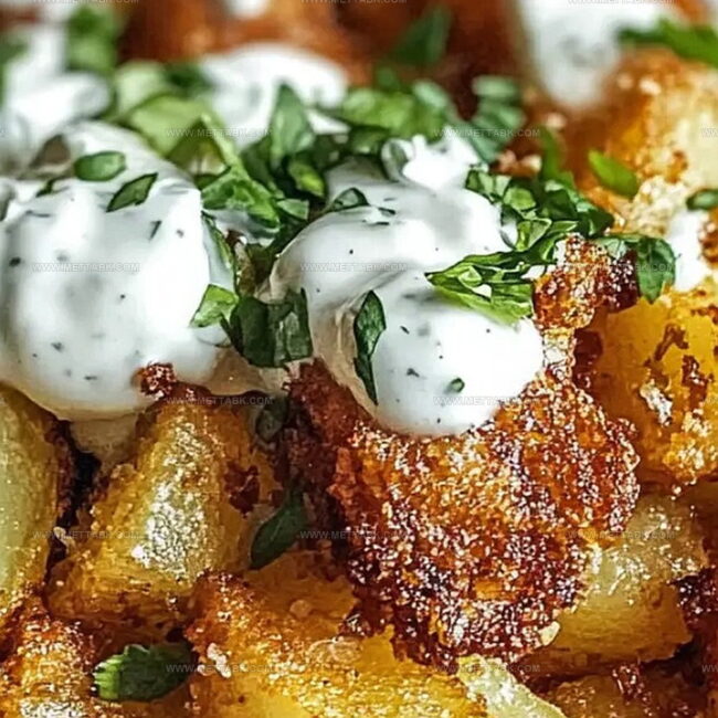 - Transfer crispy potatoes to a serving platter, generously drizzle with herbed sour cream, and garnish with fresh chives.