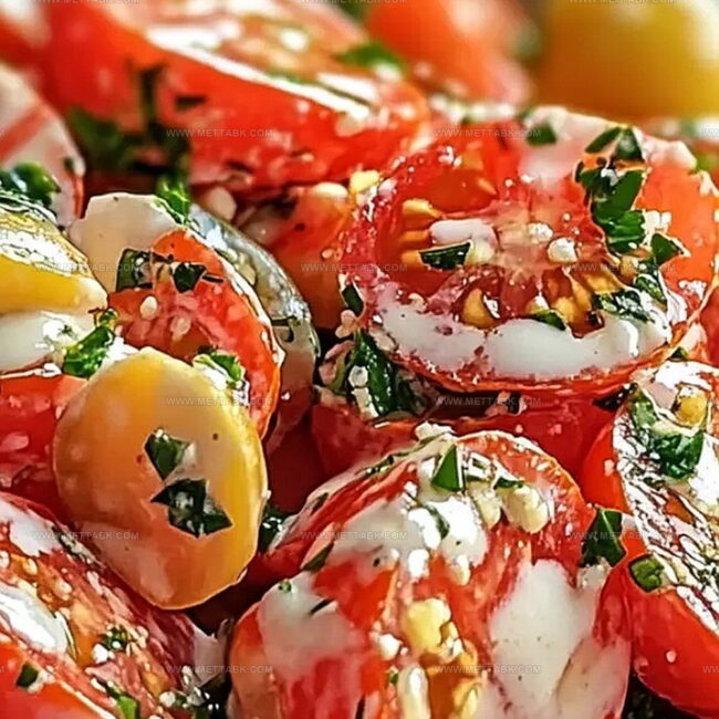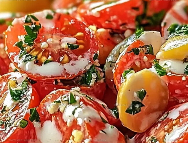 Enhance the salad’s profile with a pinch of sea salt and a dash of cracked black pepper. Tenderly mix the ingredients, ensuring each tomato piece gets coated with the dreamy dressing.