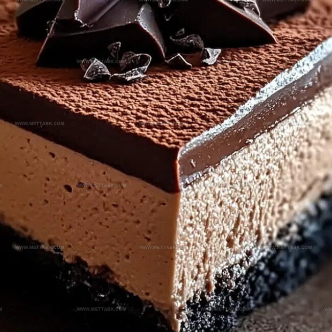 Indulgent triple chocolate mousse cake delivers pure chocolate bliss with layers of rich dark, milk, and white chocolate mousse. Chocolate enthusiasts will savor each luxurious spoonful of this elegant dessert that promises pure decadence.
